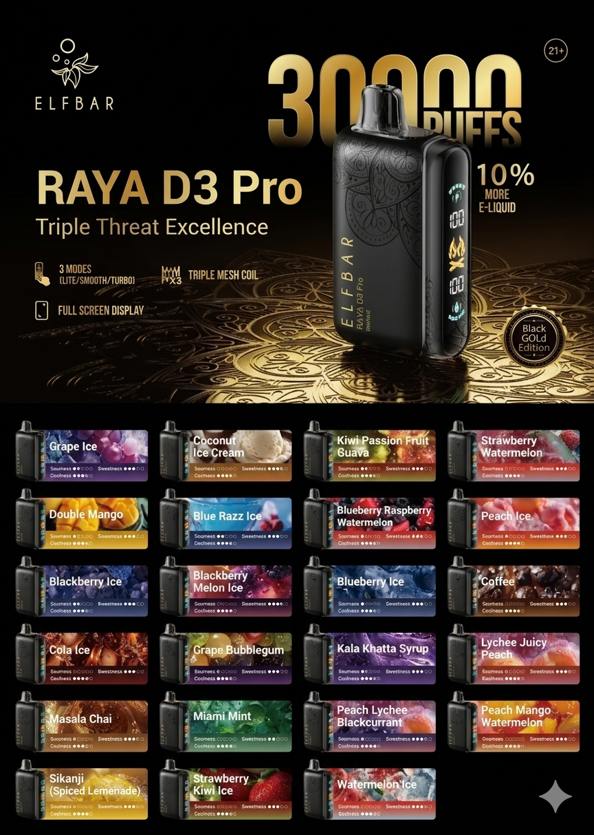 The ELF BAR RAYA D3 Pro 30000 Puffs disposable vape device delivers an exceptional combination of extended puff capacity, enhanced e liquid volume, smart monitoring, and elegant design. It is built for users who demand reliability, flavor consistency, and modern functionality in one premium device. With its long lasting performance and refined user experience, it stands as a dependable choice in the high capacity disposable vape category.