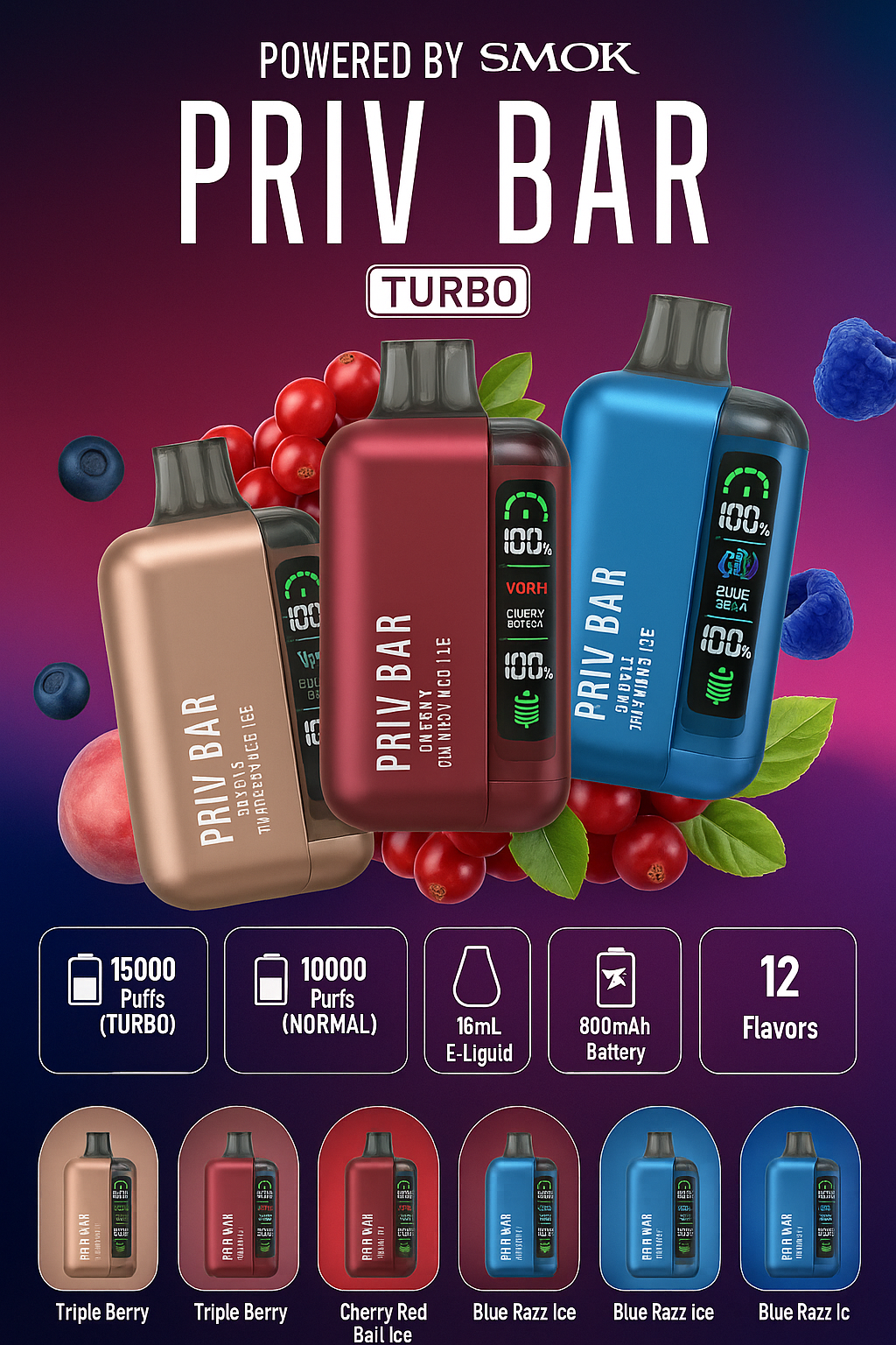 One of the defining features of the PRIV BAR TURBO is its wide range of bold and exotic flavours. Each device comes pre-filled with 16 milliliters of high-quality e-liquid at 5 percent nicotine strength, crafted for smoothness and flavour intensity. Tropical blends like Triple Mango and Peach Berry Ice offer a refreshing taste of summer fruits, while cooler mixes such as Blue Razz Watermelon and Tropical Lime Blast provide a crisp and invigorating sensation. The diverse flavour lineup ensures that there is something to satisfy every mood and craving, making your vaping experience enjoyable and versatile.